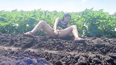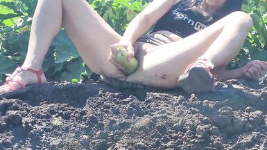 . A slender brunette saw a field in which large zucchini grow, she was not at a loss and picked a few pieces, then sat down more comfortably and fucked her cunt with these large zucchini