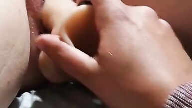 HUBBY FILLING PUSSY WITH DILDO WHILE HE'S CAGED