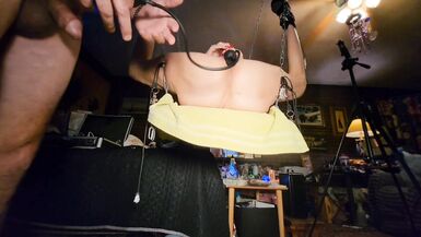 . milf gets tied to swing and gets her face fucked then expandable dildo pumped up in her ass then fucked hard in her pussy and ass